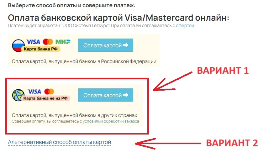 Или нажимайте на "Альтернативный способ оплаты" (вариант 2 на картинке) и также выбирайте оплату картой банка, выпущенной не в РФ.