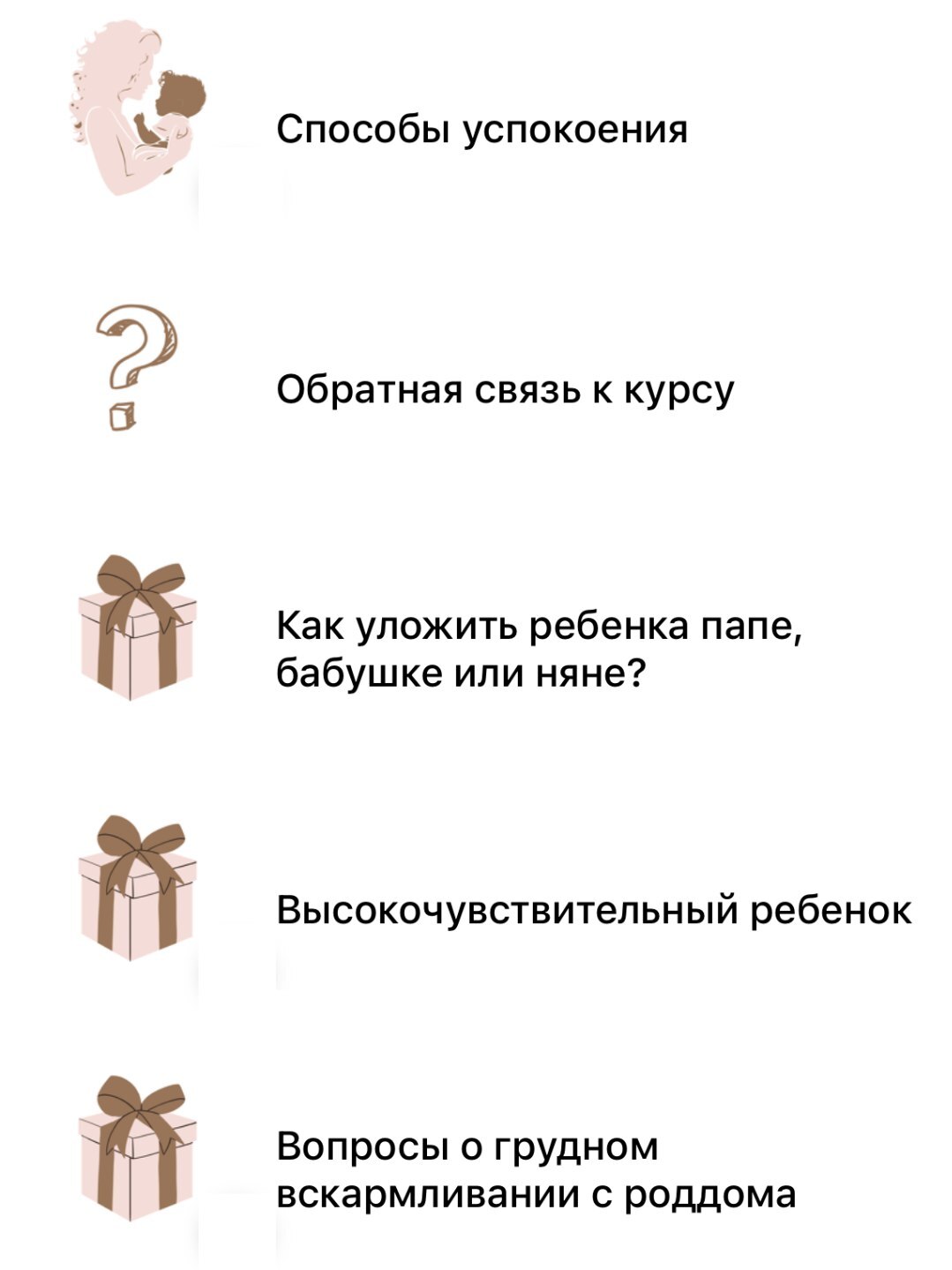 Уверенность и спокойствие, комфорт в материнстве, потому что вы знаете, как действовать в любых непредвиденных ситуациях, как вернуть качественный сон ребенка в считанные дни.