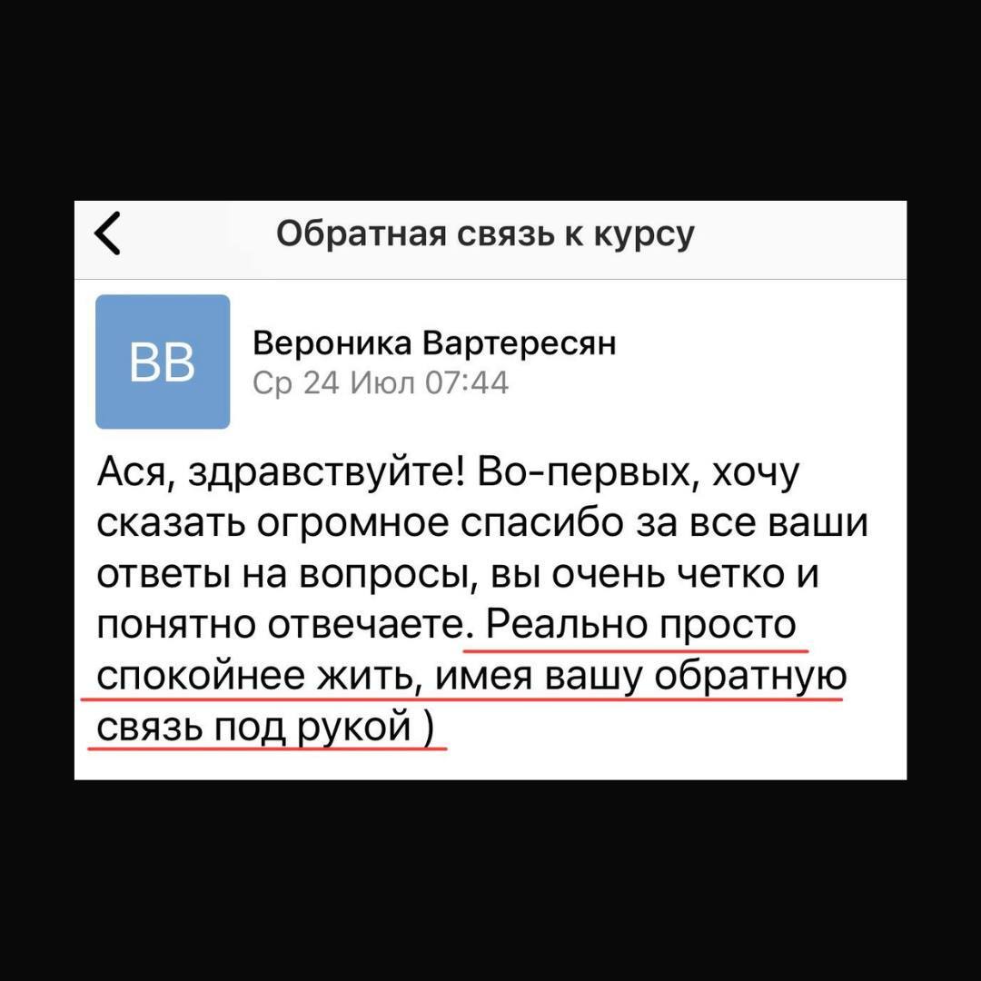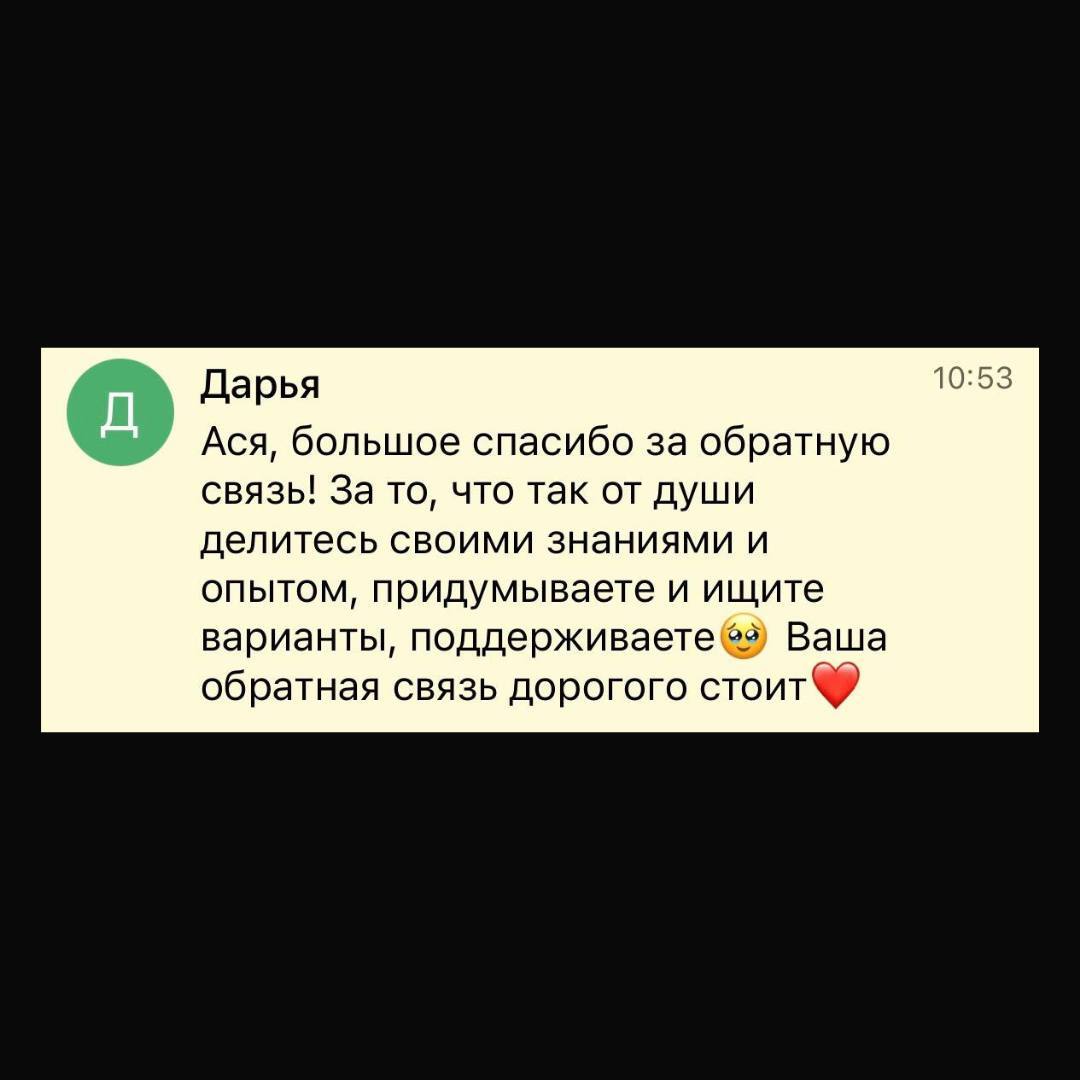 Обратную связь даю я – Ася, здесь на платформе. Даю я ее в письменном или аудио формате, в зависимости от вашего вопроса. На вопросы я отвечаю 4 дня в неделю: понедельник, вторник, четверг и пятницу, в течение всего вашего доступа к тренингу - целых 6 месяцев.